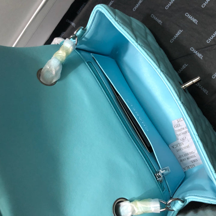 CC 20 CLASSIC SMALL DOUBLE FLAP BAG IN LIGHT BLUE CALFSKIN